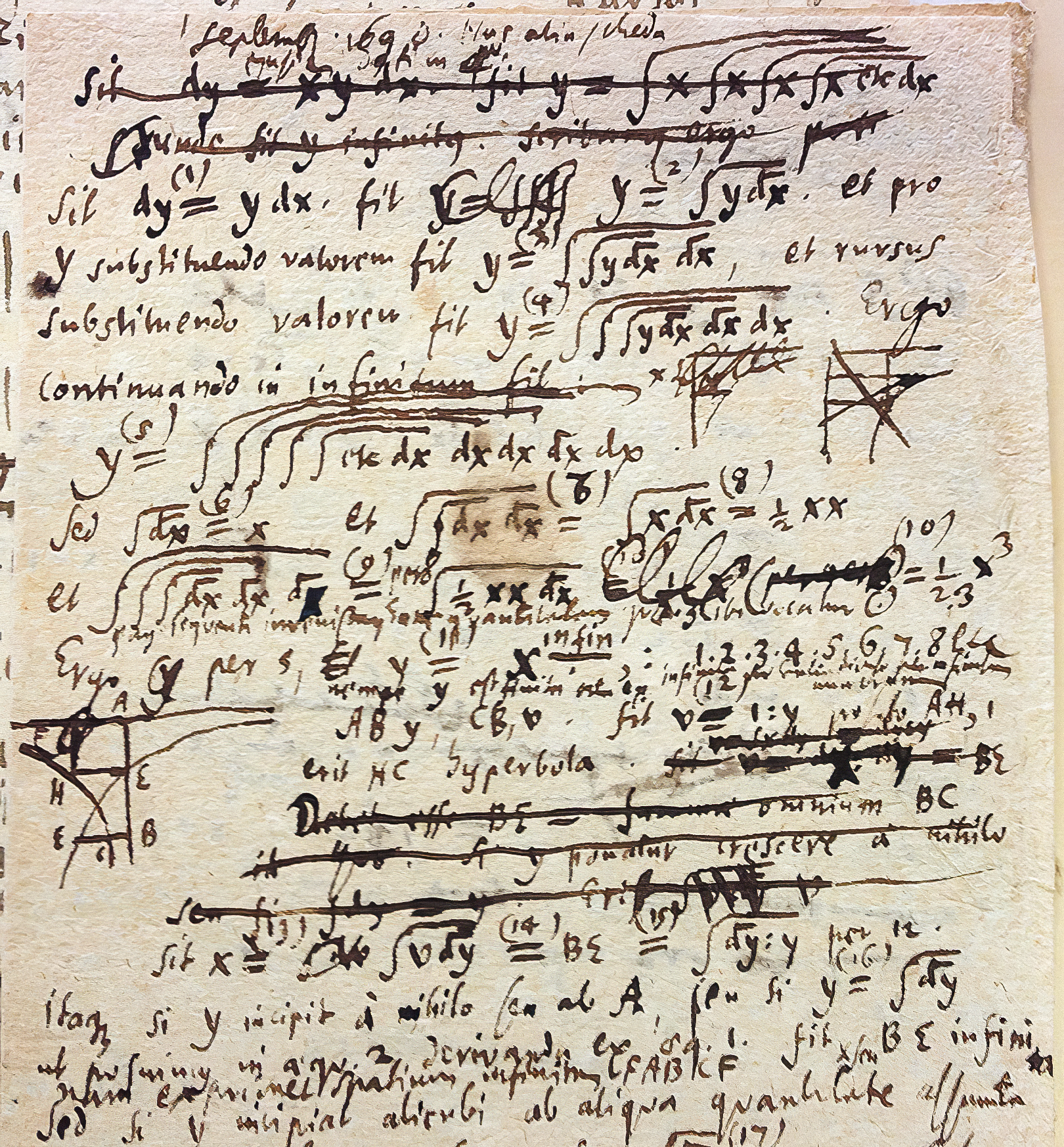 Notes that Gottfried Leibniz wrote about integral calculus, found in his archive in Hanover, Germany. His notation later gave rise to the notation we use in calculus today.