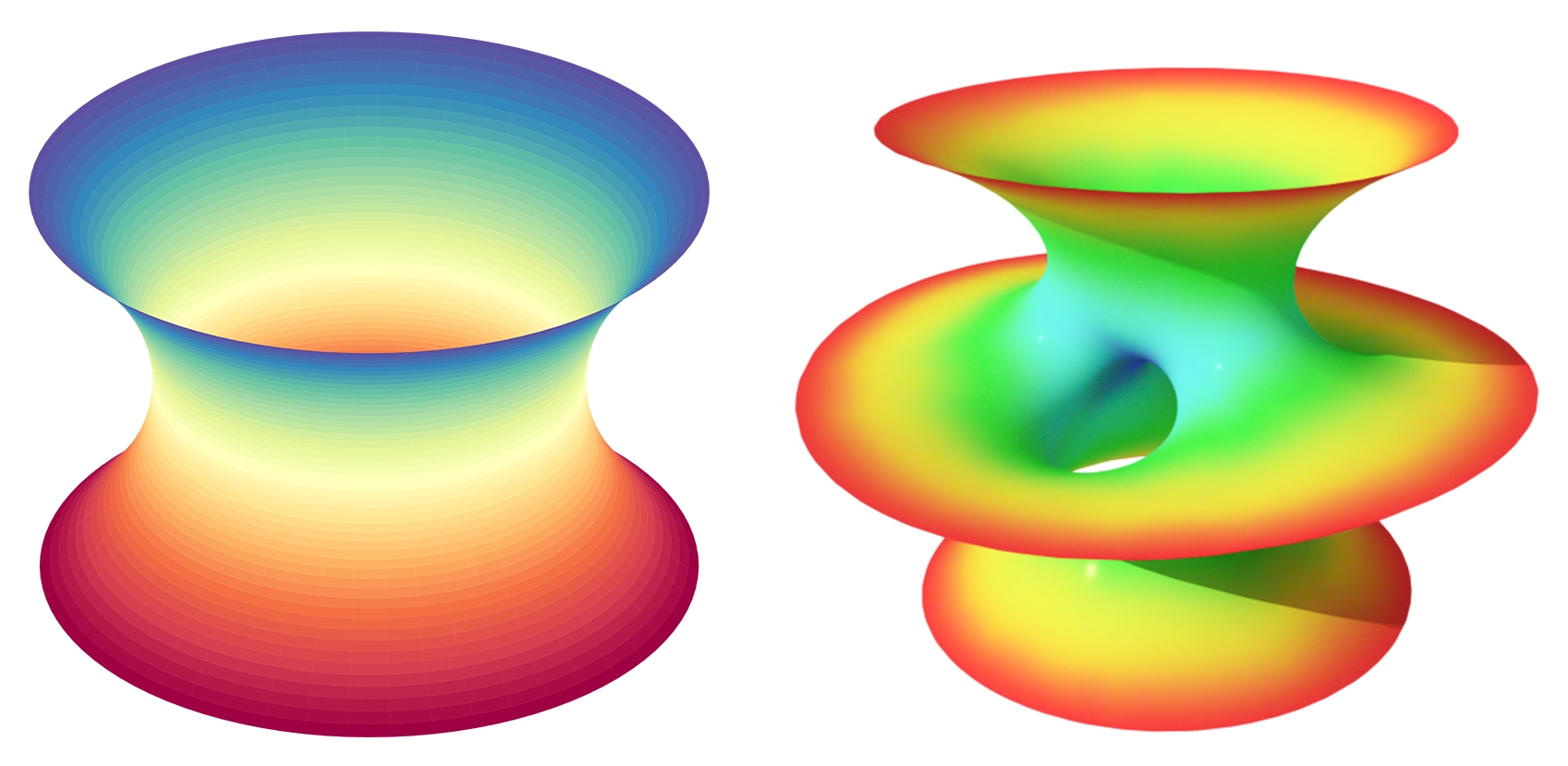 The catenoid (left) and the Costa surface are examples of area-minimizing surfaces.