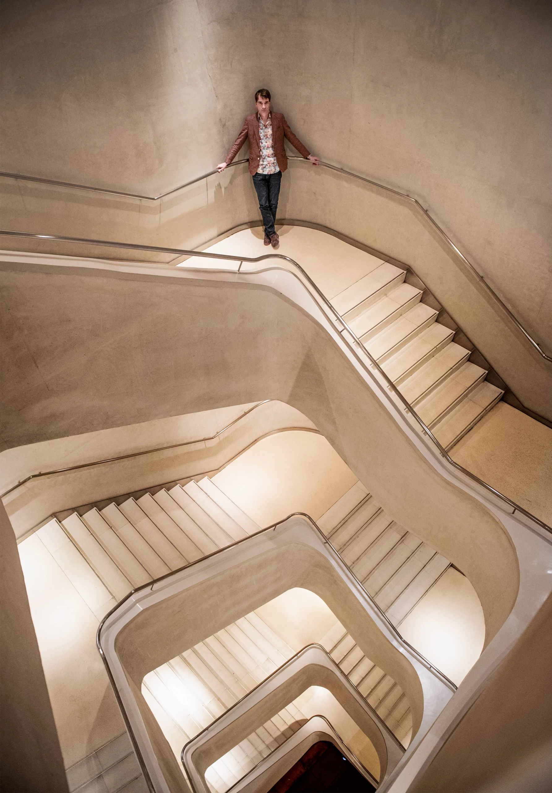 Marijn Heule stands behind artwork by David Magán at the Opera Gallery in Madrid.